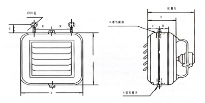 橫式單位散熱器型號說明:本散熱器是用三組數字字母表示。 第一組 表示散熱量千位數(大卡/時)。 第二組 字母表示導風葉的型式 第三組 表示散熱器排管單排(一排)、雙排(二排) 例如:4L2型即表示該散熱器具有4000千卡/時的散熱量,導風葉為“L”型,散熱排管為雙排(二排)